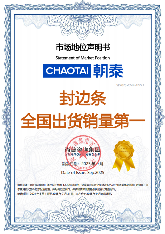 2025年9月,朝泰以其卓越的市场表现和行业影响力,正式取得由权威咨询机构尚普咨询集团授予的【封边条全国出货销量第一】市场地位声明。这份声明是对朝泰多年来深耕封边条领域的最佳认可,也是朝泰品牌实力与产品质量的权威背书。